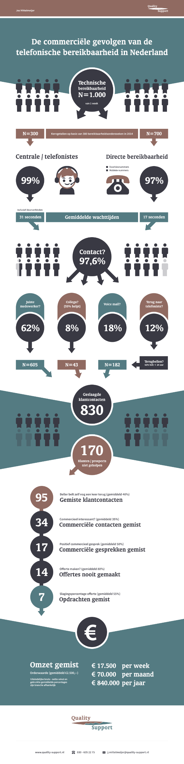 Op basis van ruim 380 telefonische bereikbaarheidsonderzoeken in 2014 stelt Quality Support vast dat bedrijven jaarlijks honderdduizenden euro’s omzet mis lopen als gevolg van slechte telefonische bereikbaarheid.